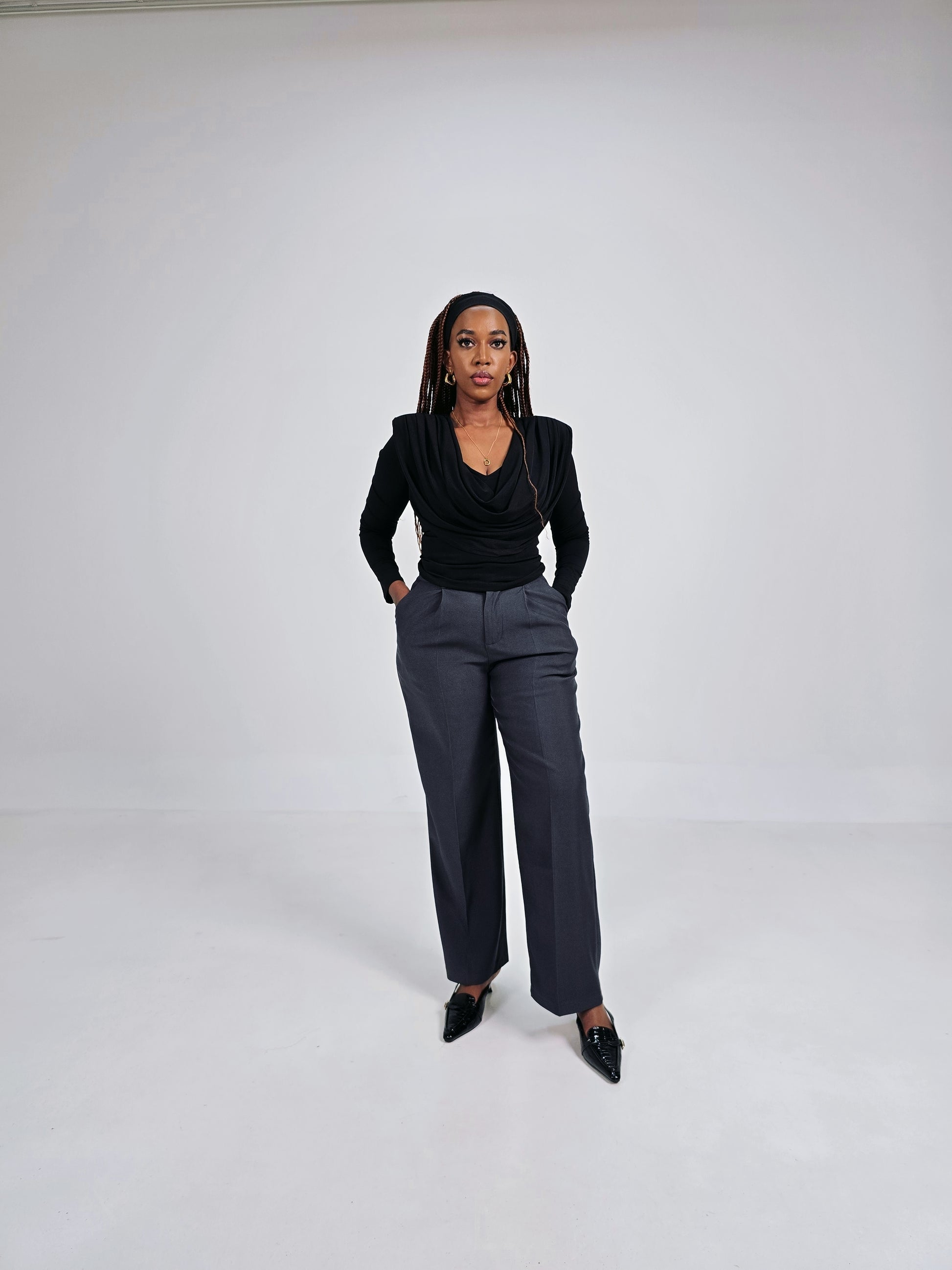 Minimal, classic, and elevated. This black drape top is designed for women who want a clean elegant frame for both work and evening wear.